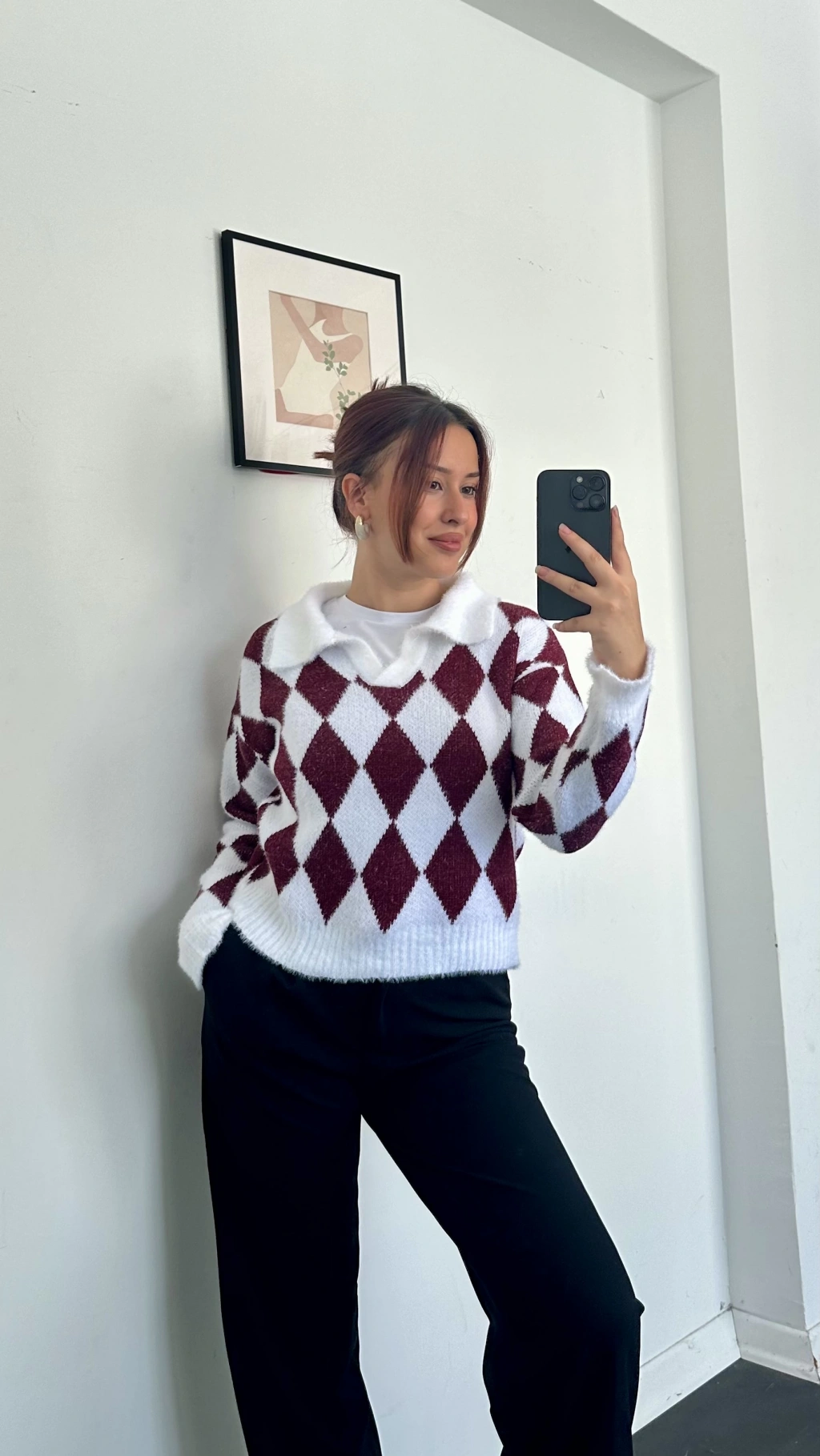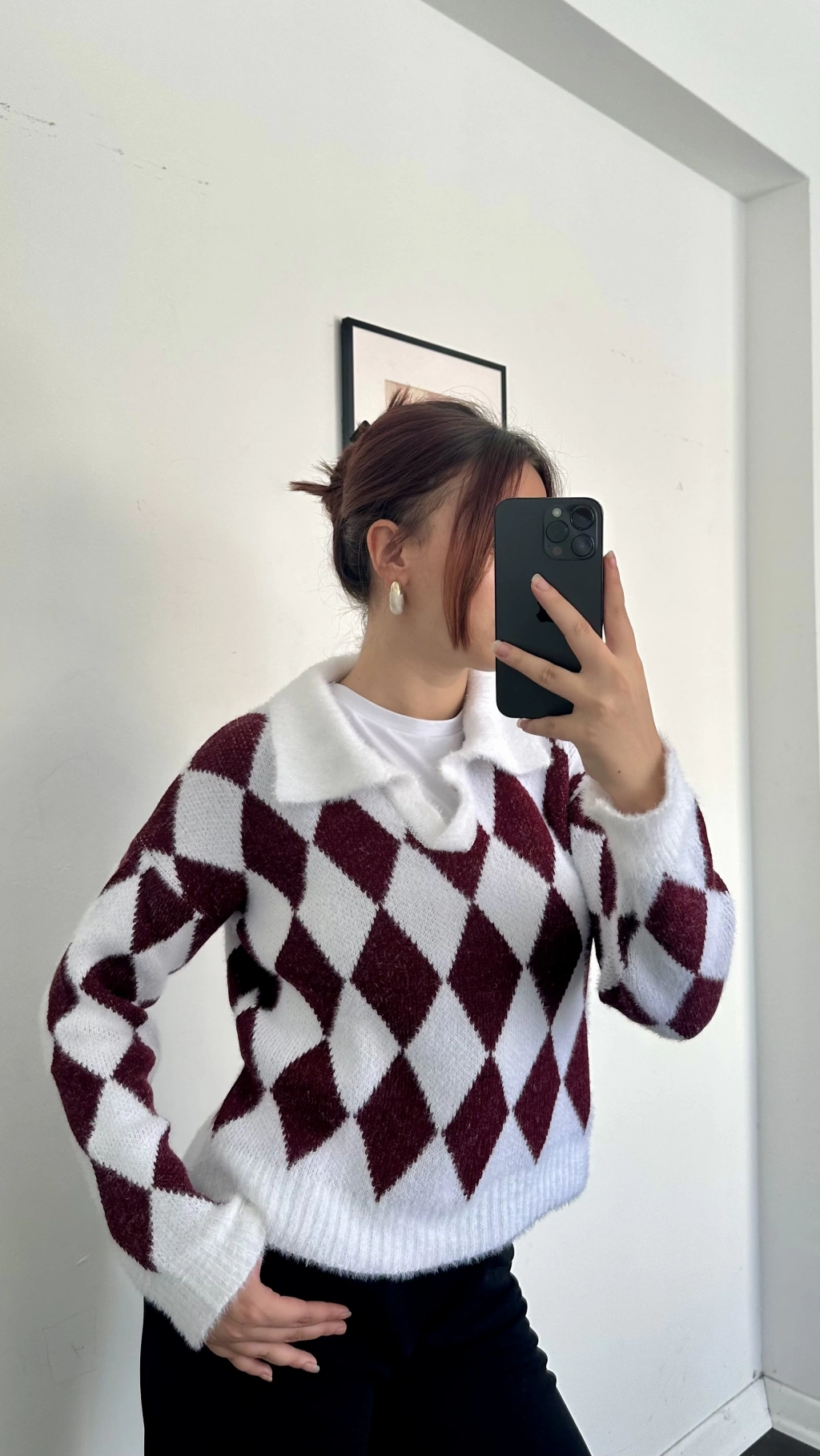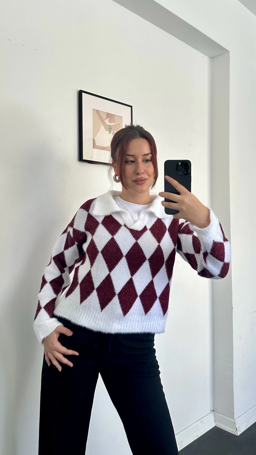 Nora Baklava Desen Polo Yaka Kazak Bordo