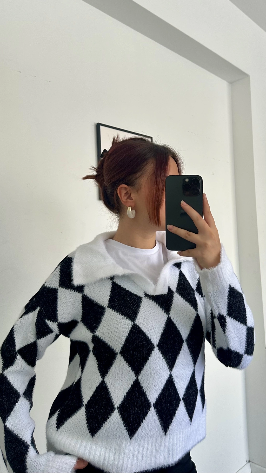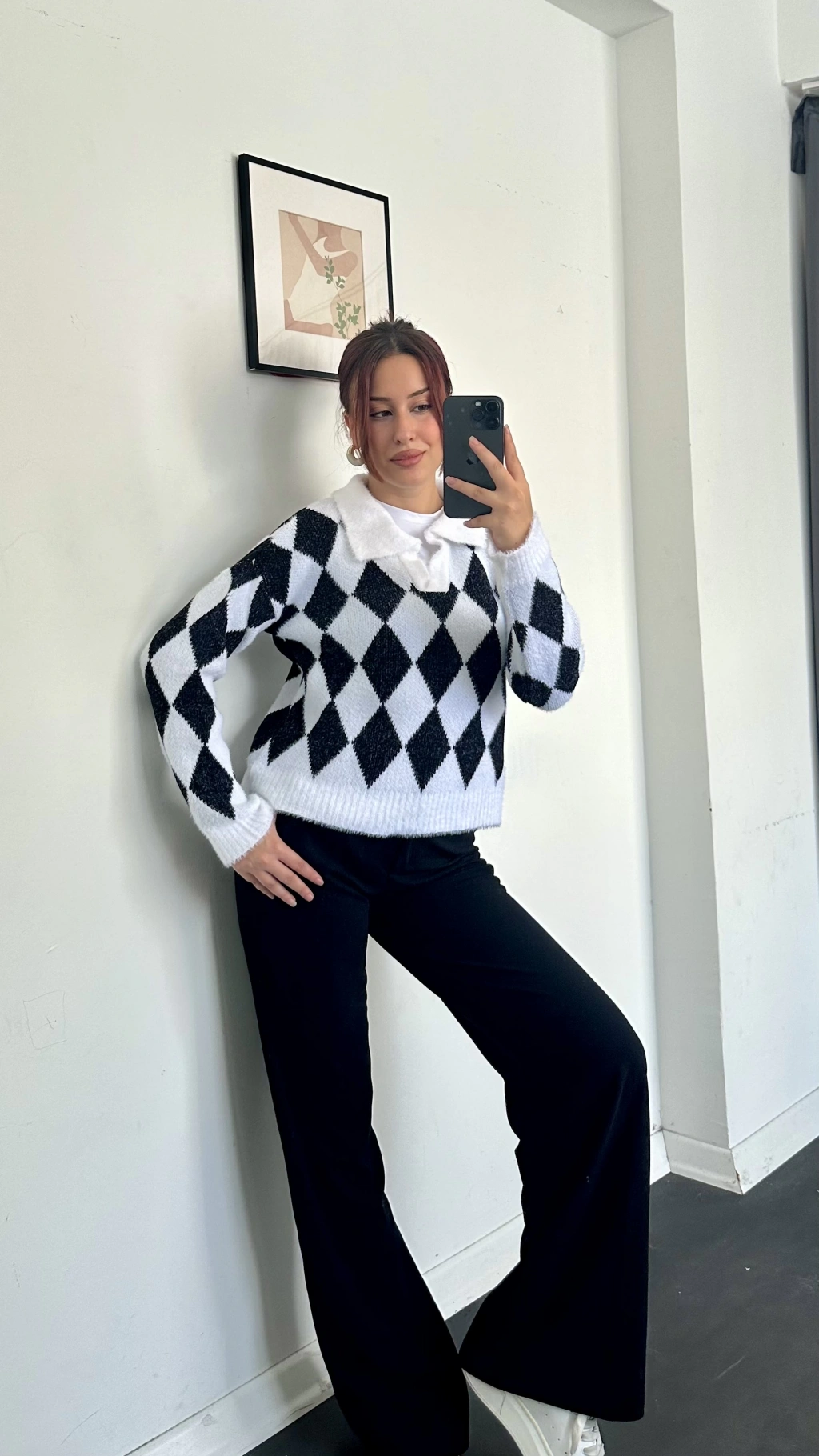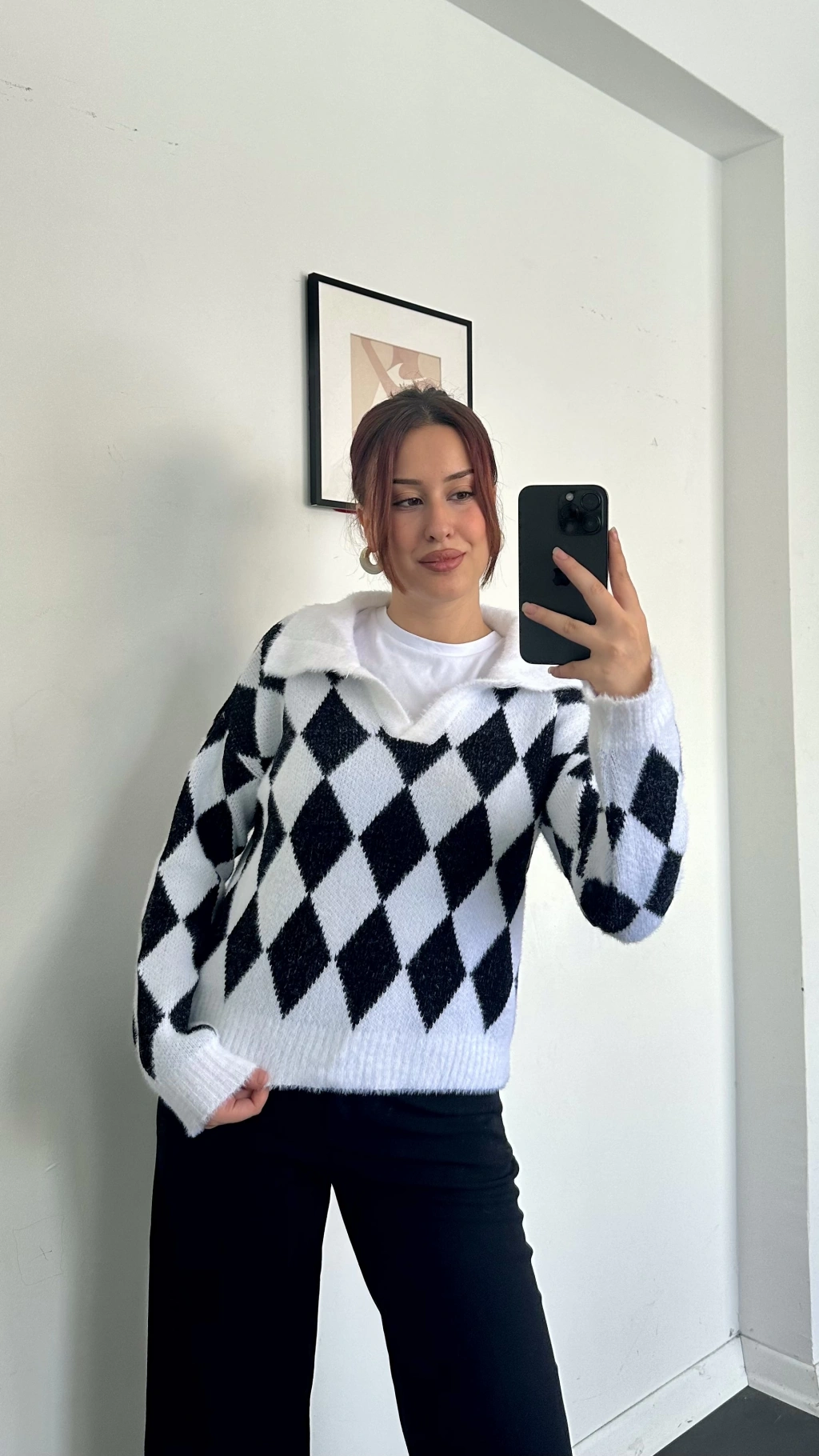 Nora Baklava Desen Polo Yaka Kazak Siyah